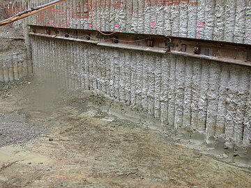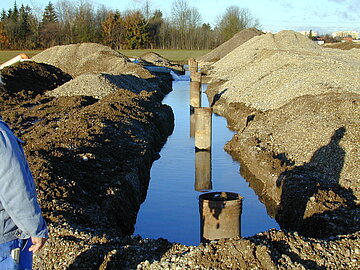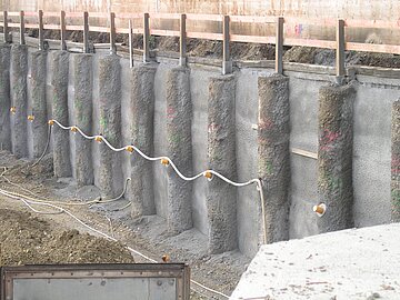 | Systemlösung: | Sondervorschlag: VDW-Pfahlwand DN 406 mm mit 1-lagiger Rückverankerung; Niederdruckinjektion Medientrassenfundament; Berliner Verbau mit 2-lagiger Rückverankerung; Baugrubenaushub und Wasserhaltung mittels Tiefendrainage mit Vakuumbeaufschlagung |