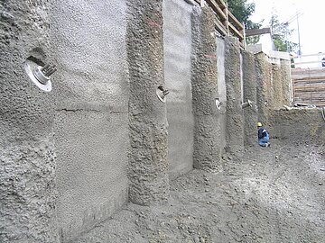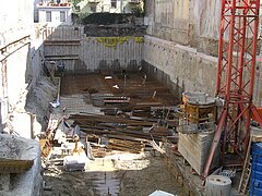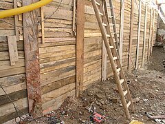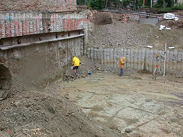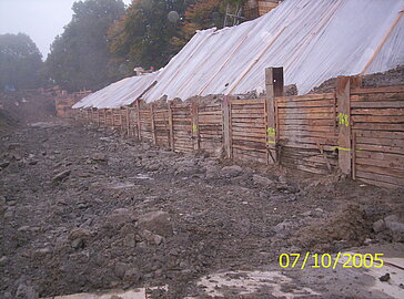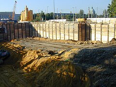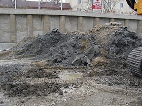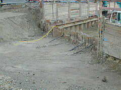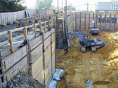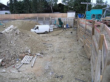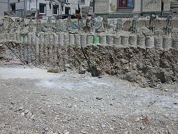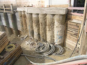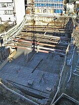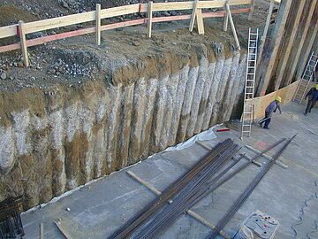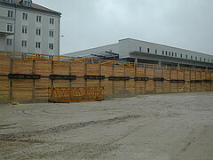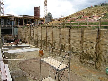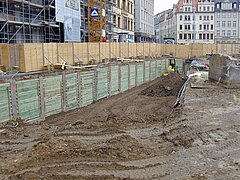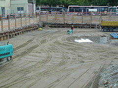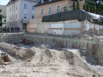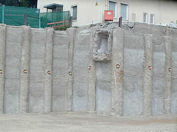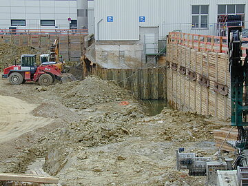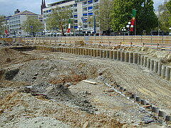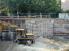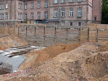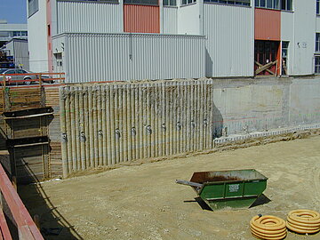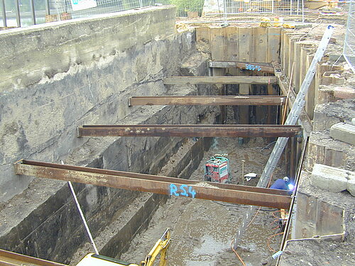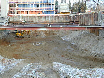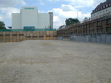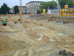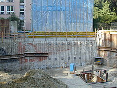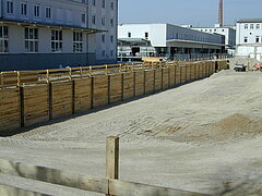 | Systemlösung: | Berliner Verbau mit Rückverankerung entlang der Gebäude; Aufgelöste Pfahlwand mit Spritzbetonausfachung und Rückverankerung, Aushubtiefe max. 8,10 m; Erdaushub und Entsorgung des kontaminierten Materials |