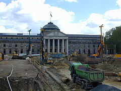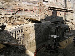 | Systemlösung: | Berliner Verbau mit Rückverankerung (Aushubtiefe ca. 5m); Gründungspfähle DN 1.200 mm (Längen 6 m – 27 m mit Einbindung in Sandstein), Rückverankerte Sonderstahlkonstruktion zur Sicherung bestehender Tunnelanlagen, Niederdruckinjektionen als Gebäudeunterfangung |