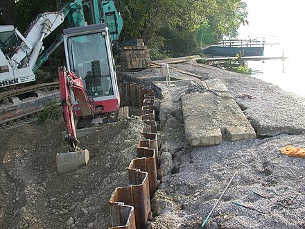 | Systemlösung: | Im Flussbett der Mulde wird ein Verbau zur Herstellung eines Schlauchwehres für das Wasserkraftwerk benötigt. Die Ausführung erfolgte mittels eines zum Teil mehrfach abgesteiften wasserdichten Spundwandkastens in 2 Abschnitten. Während des Baubetriebes wurde die Mulde jeweils zur Hälfte verjüngt. |