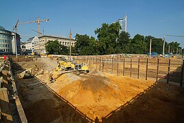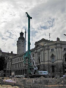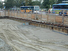 | Systemlösung: | Überschnittene Pfahlwand DN 880 mm, Pfahllänge ca. 20 m mit Rückverankerung (Aushubtiefe ca. 15 m) Gründungspfähle DN 1.200 mm (Bohrtiefe ca. 30 m) mit eingestellten konfektionierten Stahlträgern sowie DN 1.500 mm (Bohrtiefe ca. 27 m) ebenfalls mit eingestellten konfektionierten Stahlträgern als tragende Konstruktion für die TG Herstellung in Deckelbauweise, HDI als Dichtsohle und Lückenschluss zwischen bestehender Schlitzwand und neuer Pfahlwand |