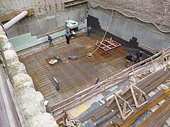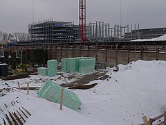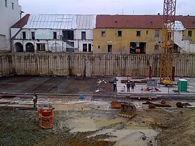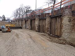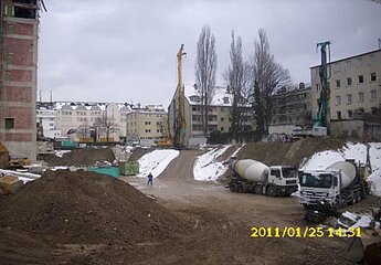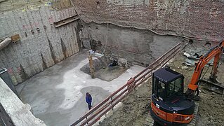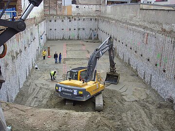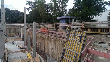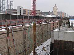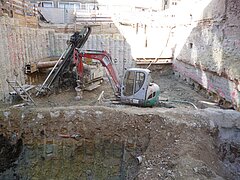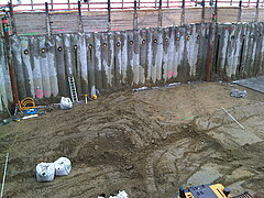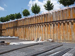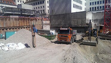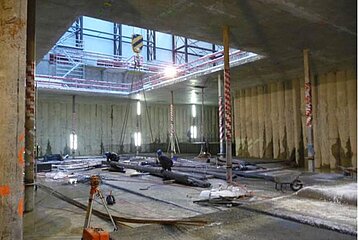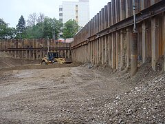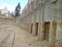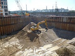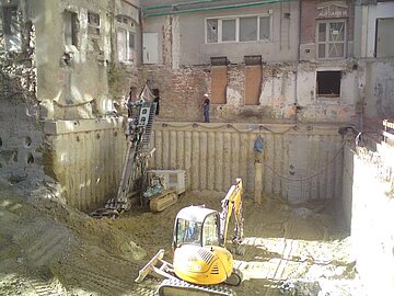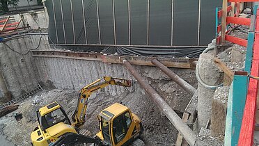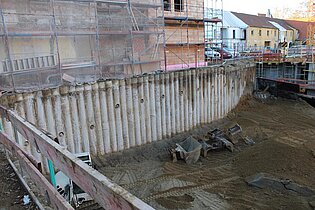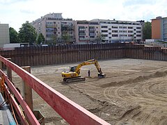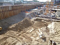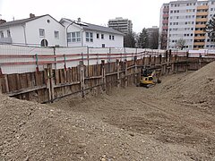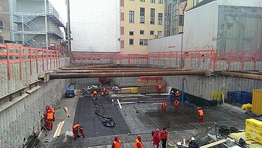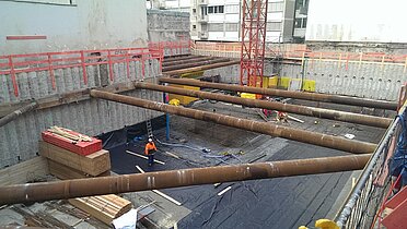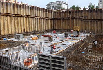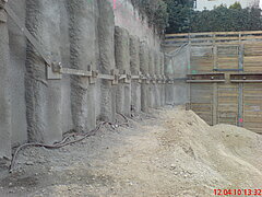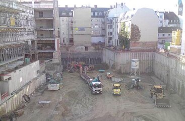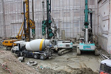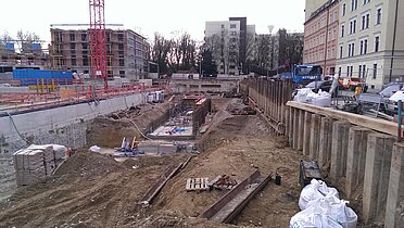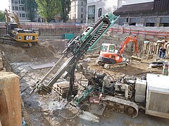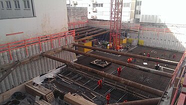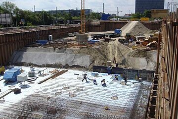 | Systemlösung: | 9.500 m² Bohrpfahlwand in DN 620 mm, 750 mm, 880 mm und 1.200 mm, teilweise 3-lagig rückverankert; gesamt 9.450 lfm Anker, Bohrpfähle DN 1200 mm unter beschränkter Arbeitshöhe, Hochhausturm mit HDI (300 m³), Wasserhaltung |